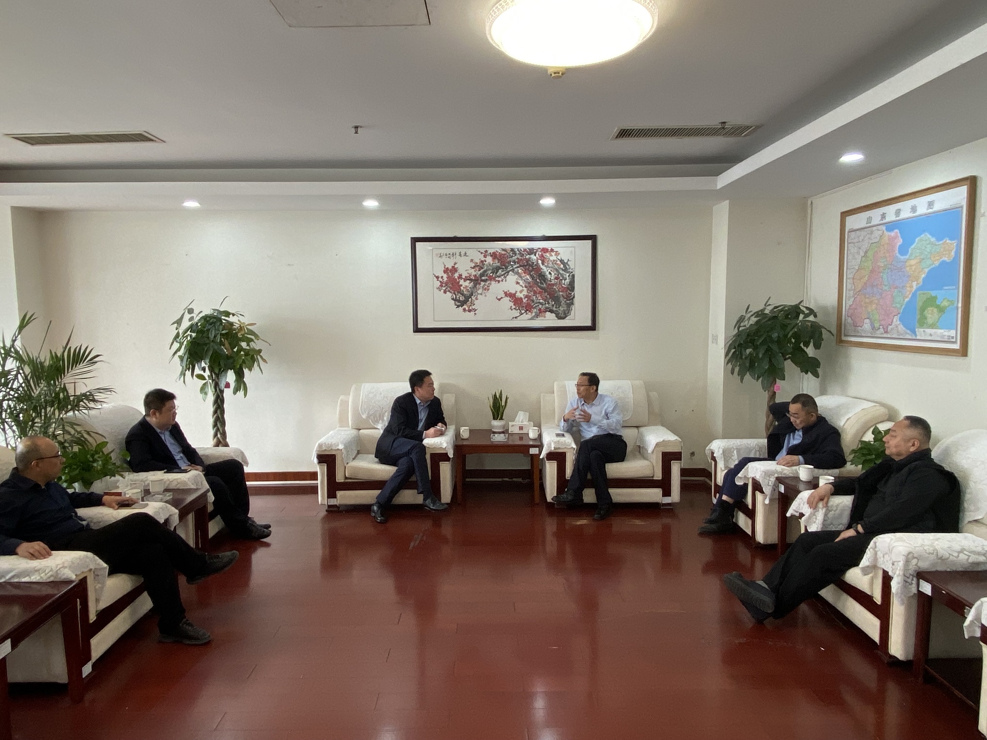随后,靳文硕等一行到青岛区域协同发展办公室同李丕明主任进行座谈交流。李丕明对靳文硕一行表示热烈欢迎,并对水总在青岛区域的投资建设给予大力支持,希望双方在此基础之上再进行深入探讨,力争实现更深层次的合作发展。
